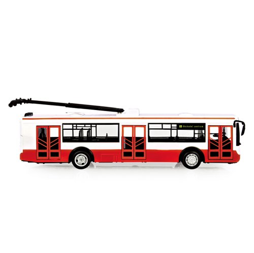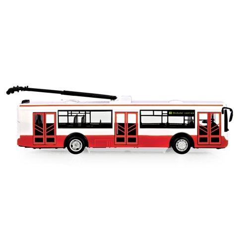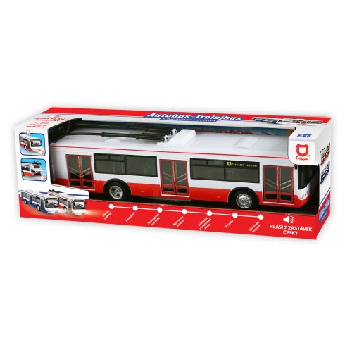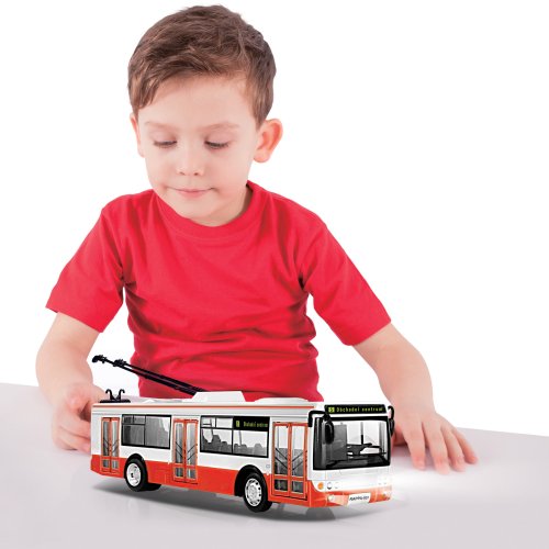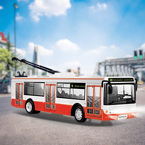 Rýchlo nastúpiť, zavrieť dvere a ideme! Originálny trolejbus, ktorý oznamuje stanice v slovenskom jazyku a jazdí na spätný chod. Dvere je možné manuálne otvoriť a zatvárajú sa pomocou tlačidla umiestneného na streche vozidla. Pri každom otvorení sa ozve hlásenie, pri zatvorení navyše blikajú predné svetlá trolejbusu. Trolejbus je vyrobený v dĺžke 28 cm a mierke 1:43. Vyžaduje použitie 3 ks batérií typu LR44/AG13, ktoré sú súčasťou balenia. Potlač názvu stanice a číslo sa môže líšiť od vyobrazenia. Táto unikátna hračka nesmie chýbať fanúšikom ekologickej dopravy!