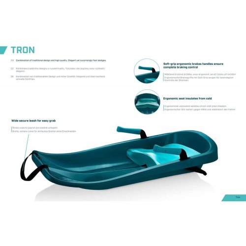 Kvalitné zimné bôby Tron sú určené pre deti vo veku 3+ rokov. Boby Tron sú vyrobené z odolného HDPE plastu, ich dĺžka je 85 cm, šírka 42 cm, výška približne 1,4 kg. jednoduchá a zvládne ju naozaj každý. Mäkčené brzdové držadlá svojou ergonómiou zaručia istotu pri brzdení. Ergonomické vstavané sedadlo chráni dieťa pred chladom. Maximálne zaťaženie bôbov Tron je 50 kg a sú k dispozícii v rôznych farebných variantoch . Výrobok je nutné používať len pod dohľadom dospelej a kompetentnej osoby, na dostatočnej vrstve snehu, na svahoch a terénoch bez pevných prekážok.