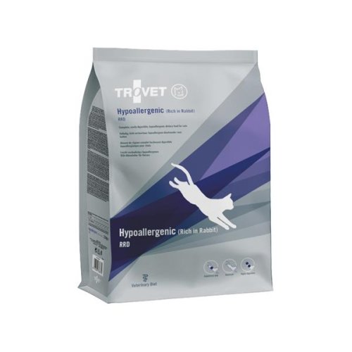 TROVET Hypoallergenic (Rabbit) je kompletné diétne krmivo pre mačky určené na zníženie intolerancie na určité zložky a živiny. Používa jediný živočíšny zdroj bielkovín (králičí proteín) a ryžu ako jediný zdroj sacharidov, čím minimalizuje riziko alergických reakcií. Kompletné hypoalergénne suché krmivo s proteínom z králika určené pre mačky trpiace alergiami. Krmivo Trovet RRD obsahuje jediný zdroj proteínu (králik) a jediný zdroj sacharidov (ryža), je preto ideálny pre eliminačnú diétu. Pomáha zmierniť príznaky alergií – zvracanie, hnačku, kožné problémy as nimi spojené vykusovanie srsti, nadmerné olizovanie, utieranie a škrabanie. Dlhodobé podávanie postupne znižuje svrbenie. Zloženie: dehydratovaný králičie proteín (24 %), ryža (23 %), ryžový proteín, hydinový tuk, ryžové otruby, fermentačné produkty, hydrolyzované hydinové mäso, kvasinky ( Saccharomyces cerevisiae ), minerálne látky, rybie tuky. Doplnkové látky: Nutričné doplnkové látky: vitamín A 15 000 MJ/kg, vitamín D 3 1 000 MJ/kg, vitamín E 200 mg/kg, vitamín C 200 mg/kg, železo (síran železitý (II) monohydrát) 75 mg/kg, jód (síran meďnatý (II) pentahydrát) 10 mg/kg, mangán (síran manganatý monohydrát) 7,5 mg/kg, zinok (oxid zinočnatý) 120 mg/kg, selén (seleničitan sodný) 0,12 mg/kg, taurín 1 800 mg/kg. Technologické doplnkové látky: antioxidanty. Analytické zložky: hrubý proteín 29,5%, hrubý tuk 19%, hrubá vláknina 1,5%, hrubý popol 8%, vápnik 1,3%, fosfor 1,1%, sodík 0,45%, draslík 0,51%, EPA + DHA 500 mg/kg, mastné kyseliny 3,5%. Metabolizovateľná energia: 4 065 kcal/kg Odporúčané dávkovanie: