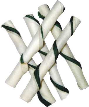 Bezlepková pochúťka pre psov v tvare trubičiek z bielenej kože s mint príchuťou.