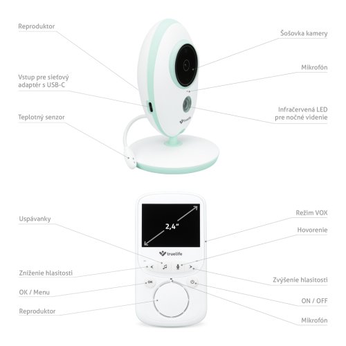 Obľúbená opatrovateľka, overená zákazníkmi, TrueLife NannyCam V24 vo vylepšenej verzii je tu. TrueLife NannyCam V24 Pro je digitálna video opatrovateľka s prehľadným farebným 2,4 palcovým LCD displejom, izbovým teplomerom, automatickým nočným módom a moderným USB-C pripojením pre rýchle a spoľahlivé nabíjanie. Prenos zvuku aj obrazu je vysoko kvalitný vo dne aj v noci. Môžete byť v pokoji a mať istotu, že je s Vašimi blízkymi všetko v poriadku, pretože použitá digitálna technológia s frekvenciou 2.4 GHz zaručuje bezpečný a stabilný signál.