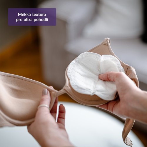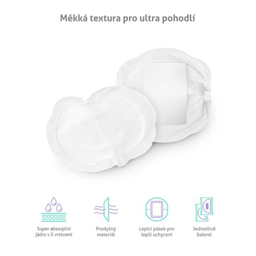 Diskrétne a pohodlné Prsné vložky s povrchom mäkkej textúry sú pre okolie úplne neviditeľné vďaka hrúbke iba 2 mm. Pri svojej tenkosti sa do nich zmestí pohodlne až 80 ml mlieka.