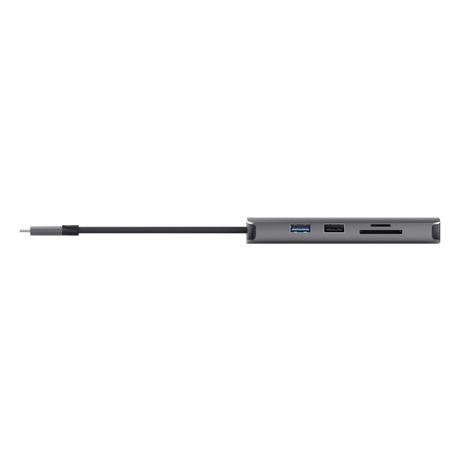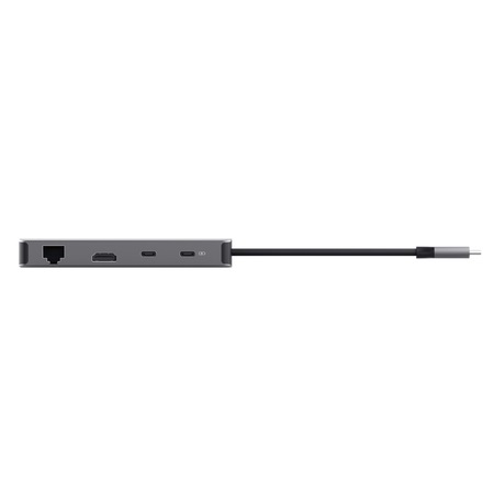 Štýlový hliníkový viacportový adaptér pre pridanie portov HDMI, sieťového portu, čítačky kariet, USB-C a USB portov k notebooku pomocou jediného pripojenia USB-C.