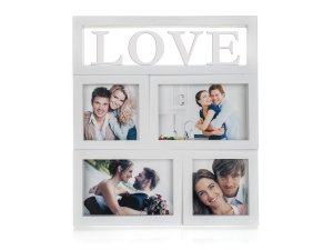 Fotorámik na 4 LOVE fotografie vo veľkosti 2x 9x9 cm a 2x 10x15 cm, je vybavený praktickými závesmi na montáž na stenu (hmoždinky a skrutky nie sú súčasťou balenia).