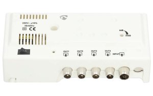 Štvorcestný anténny zosilňovač pre vnútorné použitie s 20 dB zosilnením a aktívnou distribúciou signálu 47-694 MHz.