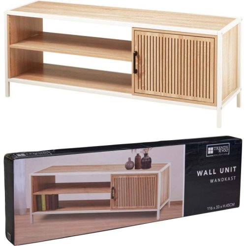 Štýlová skrinka s bielym kovovým rámom , vybavená MDF policami a dverami z prírodnej MDF dyhy , s 3 úložnými vrstvami pre praktické uloženie drobných predmetov.