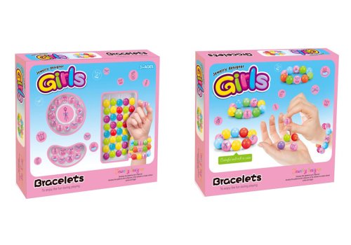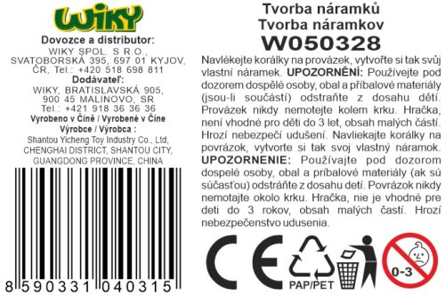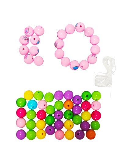 Tvorba náramkov korálky. Obsahuje koláriky rôznych farieb a ružové korálky s obrázkami.