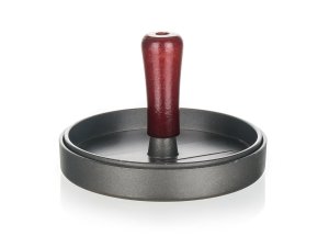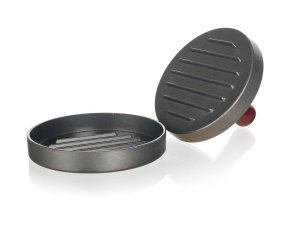 Forma na výrobu hamburgerov z mletého mäsa vyrobená z liateho hliníka a opatrená nepriľnavým povrchom doplnená dreveným madlom.