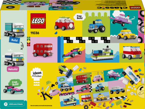 Malí nadšenci do áut od 5 rokov si priamo zamilujú stavebnicu LEGO® Classic (11036) Tvorivé vozidlá. Z tejto inšpiratívnej sady pestrofarebných dielikov a kociek je možné postaviť rad vozidiel av balení nájdete aj jednoduché návody na zostavenie neobmedzene prestaviteľných vozidiel.