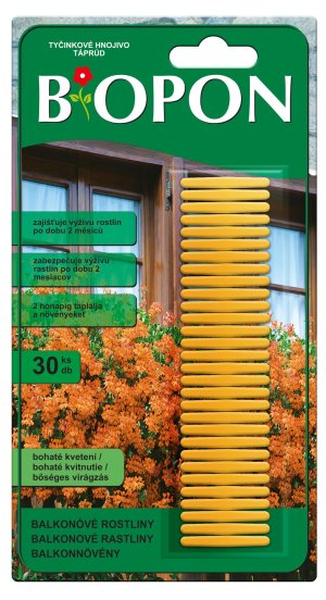 Viaczložkové hnojivo vo forme tyčiniek je určené pre balkónové rastliny. Obsahuje veľké množstvo minerálnych živín a zvýšenú dávku ľahko asimilovateľného železa. Stimuluje tvorbu silných pukov, zlepšuje farbu kvetov, rastliny robia odolnejšie voči vetru a ľahkému mrazu. Tyčinky sa rozpúšťajú postupne - vyživujú rastliny až 2 mesiace.