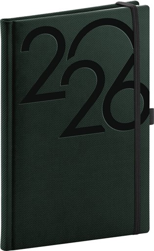 Týždenný diár Ajax 2026 v zelenej farbe. Jemne štruktúrovaný povrch s atypickým reliéfom je vhodný pre všetky typy razieb. Diár má zaguľatené rohy, pútko na ceruzku a elastickú gumičku. Týždenný rozvrh s česko-slovenským kalendáriom a doplnkovou angličtinou, nemčinou, maďarčinou a ruštinou.