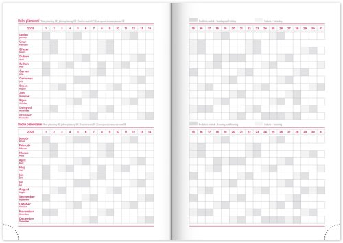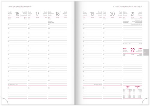 Týždenný diár Aprint 2025 formátu B5 v červenej farbe. Nová kolekcia stavila na osvedčené farby, ktoré dopĺňa nová razba letopočtu. Týždenný rozvrh s česko-slovenským kalendáriom a doplnkovou angličtinou, nemčinou, maďarčinou a ruštinou.