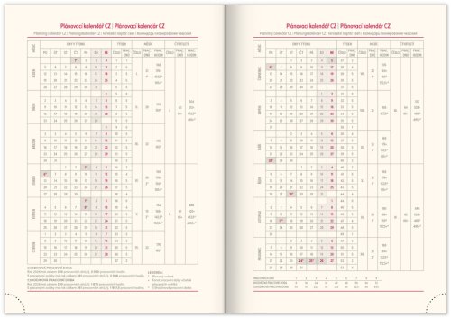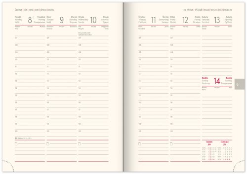 Nový rad diárov s výrazným letopočtom. Povrch má jemnú štruktúru a je vhodný pre všetky typy razieb. Týždenné rozloženie s česko-slovenským kalendáriom a doplnkovou angličtinou, nemčinou, maďarčinou a ruštinou.