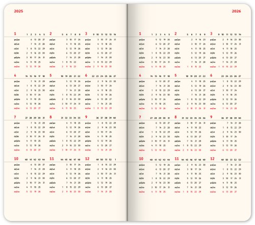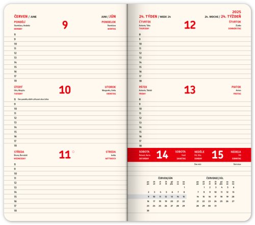 Obsahuje štvorjazyčné kalendárium, ktoré napriek tomu pôsobí veľmi čisto a prehľadne, zoznamy českých a slovenských mien, prehľad medzinárodných sviatkov a priestor na poznámky.