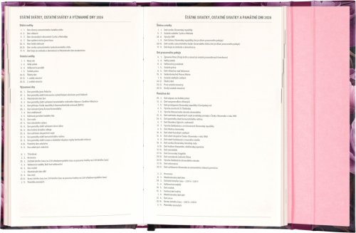 Týždenný diár s praktickým magnetickým uzatváraním je ideálnou voľbou pre tých, ktorí chcú mať svoje plány prehľadne pod kontrolou. Ponúka stĺpcové rozvrhnutie jednotlivých týždňov s dostatkom priestoru na každodenné poznámky. Súčasťou sú praktické mesačné prehľady, ideálne na plánovanie dovoleniek či prázdnin, a tiež zoznam českých a slovenských sviatkov a menín.