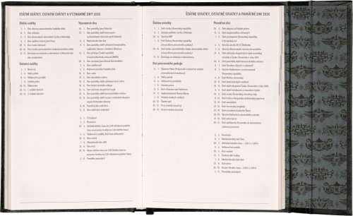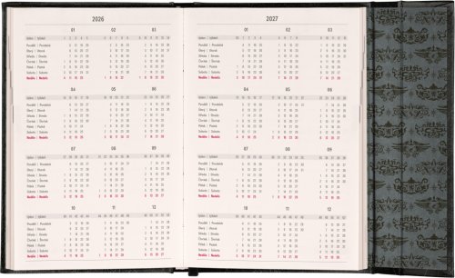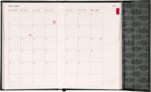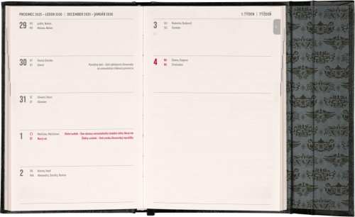 Týždenný diár s praktickým magnetickým uzatváraním je ideálnou voľbou pre tých, ktorí chcú mať svoje plány prehľadne pod kontrolou. Horizontálne rozloženie s českým a slovenským kalendáriom vo verzii týždeň na dvoch stranách s priestorom na poznámky. Súčasťou sú praktické mesačné prehľady, ideálne na plánovanie dovoleniek či prázdnin, a tiež zoznam českých a slovenských sviatkov a menín.