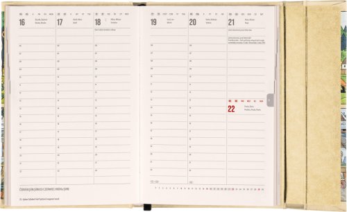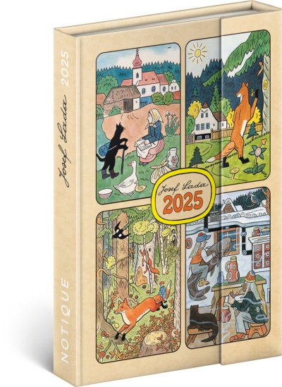 Šesťjazyčný týždenný diár s magnetickým uzatváraním obsahuje prehľad medzinárodných sviatkov, zoznam českých a slovenských mien, prehľad rokov 2025 a 2026, dodatočné stránky na poznámky a vrecko na zadnej predsádke. Stĺpcové rozvrhnutie s priestorom na poznámky na každý deň. Diár je v dizajne ilustrácií Jozefa Lady.