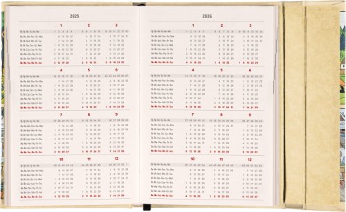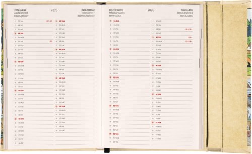Šesťjazyčný týždenný diár s magnetickým uzatváraním obsahuje prehľad medzinárodných sviatkov, zoznam českých a slovenských mien, prehľad rokov 2025 a 2026, dodatočné stránky na poznámky a vrecko na zadné …