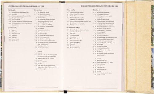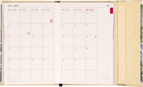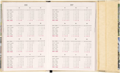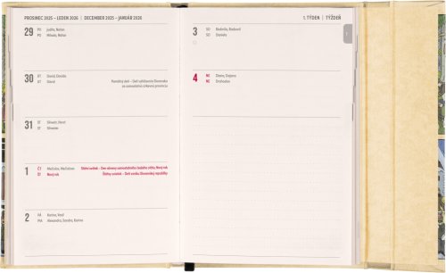 Týždenný diár s praktickým magnetickým uzatváraním je ideálnou voľbou pre tých, ktorí chcú mať svoje plány prehľadne pod kontrolou. Horizontálne rozloženie s českým a slovenským kalendáriom vo verzii týždeň na dvoch stranách s priestorom na poznámky. Súčasťou sú praktické mesačné prehľady, ideálne na plánovanie dovoleniek či prázdnin, a tiež zoznam českých a slovenských sviatkov a menín.