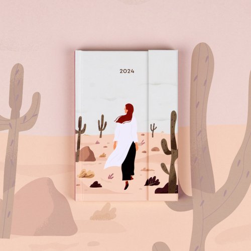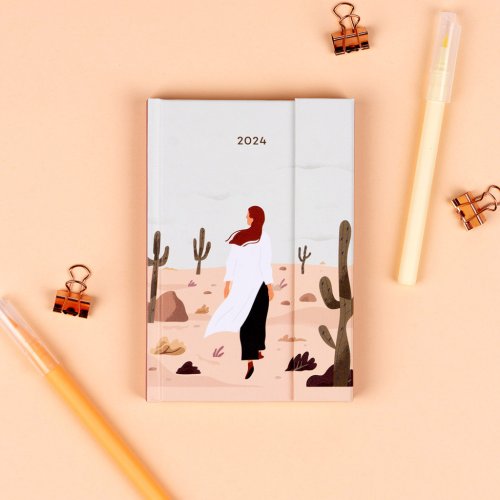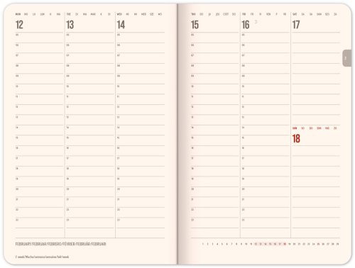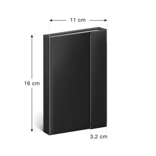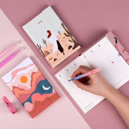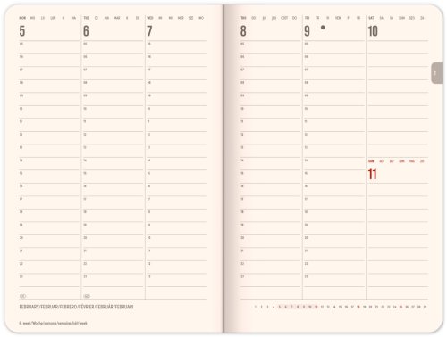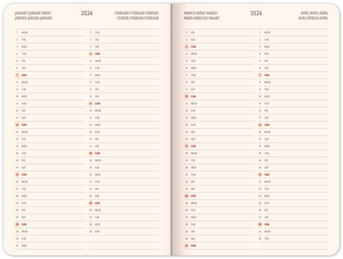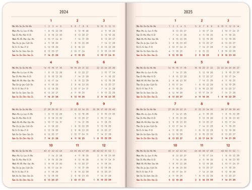 Šesťjazyčný týždenný diár s magnetickým uzatváraním obsahuje prehľad medzinárodných sviatkov, zoznam českých a slovenských mien, prehľad rokov 2024 a 2025, adresár a vrecko na zadnej predsádke. Stĺpcové rozvrhnutie s priestorom na poznámky na každý deň.