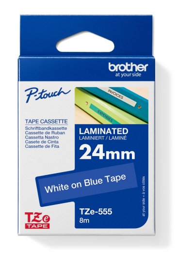 Originálna kazeta s laminovanou páskou TZe-555 kompatibilná so širokým radom tlačiarní Brother P-touch je obzvlášť všestranná vďaka svojej ľahko čitateľnej bielej a modrej farbe - ideálna pre domácnosť, kanceláriu a ďalšie pracoviská.