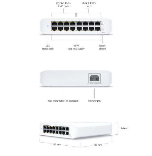 USW-Lite-16-PoE je Gigabitový PoE L2 Switch od Ubiquiti Networks v desktop prevedení s maximálnym PoE budgetom 45W.