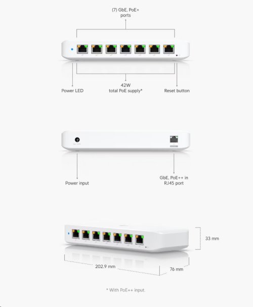 Kľúčové vlastnosti Počet portov: 7× GbE RJ-45 PoE+ výstup (802.3at) 1× GbE RJ-45 PoE++ vstup (802.3bt) PoE budget: 42 W pri napájaní cez PoE++ 16 W pri napájaní cez PoE+ 52 W pri napájaní cez 60 W DC DC adaptér (nie je súčasťou balenia) Kapacita switcha: 16 Gbps Neblokujúca priepustnosť: 8 Gbps Možnosti montáže: Možnosť montáže na stenu (montážna sada je súčasťou balenia) Rozmery: 203 × 76 × 33 mm Hmotnosť: 320 g