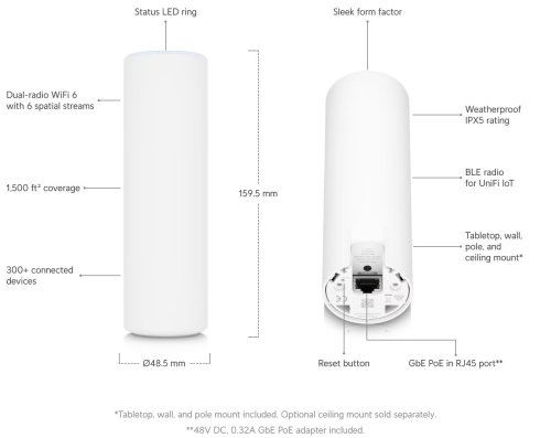 Vhodný pre vnútorné aj vonkajšie použitie vďaka IPX5 krytiu. Bezproblémová integrácia a správa pomocou sieťového riešenia UniFi. Súčasťou balenia sú držiaky na montáž na stenu, stĺp a stôl.