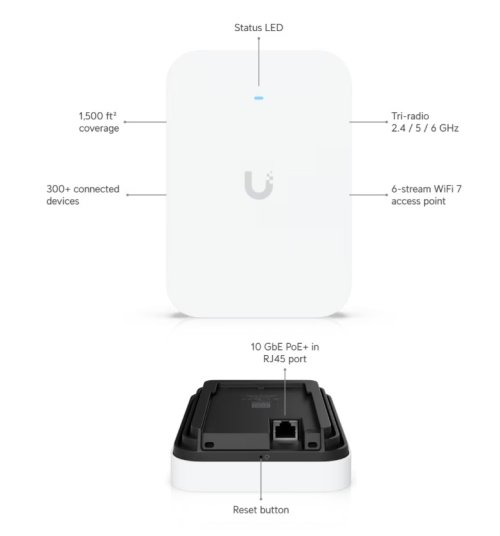 Prehľad * Rozmery: 155 × 108 × 33,5 mm * Wi-Fi štandard: Wi-Fi 7 (802.11be) * Počet priestorových streamov: 6 * Pokrytie: až 140 m2 * Max. počet klientov: 300+ * Uplink: 10 GbE * Montáž: na stenu * Napájanie: PoE+