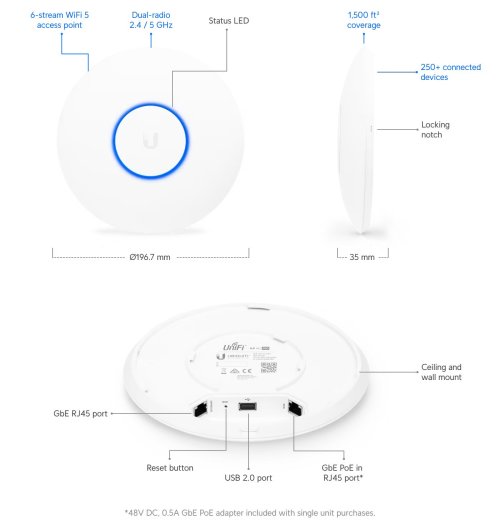Frekvencia [GHz]: 2,4 + 5 Gigabit LAN: Áno LAN: (2) 10/100/1000Mbps Max. spotreba energie [W]: 9 Napájanie cez PoE: 802.3at Napájanie cez PoE: 44 .. 57V DC Operačný mód: Access Point Počet LAN portov: 2 Bluetooth: Áno Počet vstavaných antén: 3 Podpora IPv6: Transparentný (režim bridge) PoE: Vstupný rýchlosť WiFi - 2,4GHz [Mb/s]: 450 Prenosová rýchlosť WiFi - 5GHz [Mb/s]: 1300 Výstupný výkon 2,4GHz [dBm]: 22 Výstupný výkon 5GHz [dBm]: 22 Roaming: Áno Šifrovanie: WEP, WPA-PSK, WPA Tlačidlá: Reset Typ antény: Vstavaná Predvolená IP adresa: Dynamická z DHCP Predvolené meno a heslo: Ubiquiti/Ubiquiti WiFi štandardy: 802.11ac, 802.11n, 802.11a, 802.11b, 802.11g Zisk 197 Výška [mm]: 35 Hĺbka [mm]: 197 Hmotnosť [g]: 350