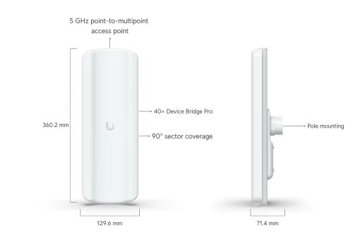 Technické špecifikácie Rozmery: 360,9 × 129,6 × 71,4 mm Wi-Fi štandard: Wi-Fi 5 Priestorové prúdy: 2 Oblasť pokrytia: 5 km Miesta pre montáž: Pól Odolnosť voči poveternostným vplyvom: IPX6 Metóda napájania: PoE