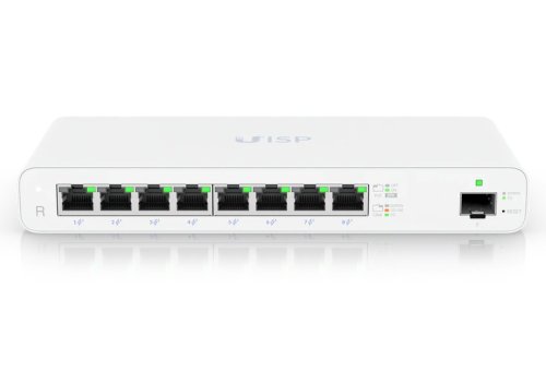 UISP Router je osadený ôsmimi GbE PoE RJ-45 a jedným GbE SFP slotom pre uplink. Celková napájacia PoE kapacita je 110 W . Router je možné navyše upevniť k stene, vďaka priloženému držiaku.