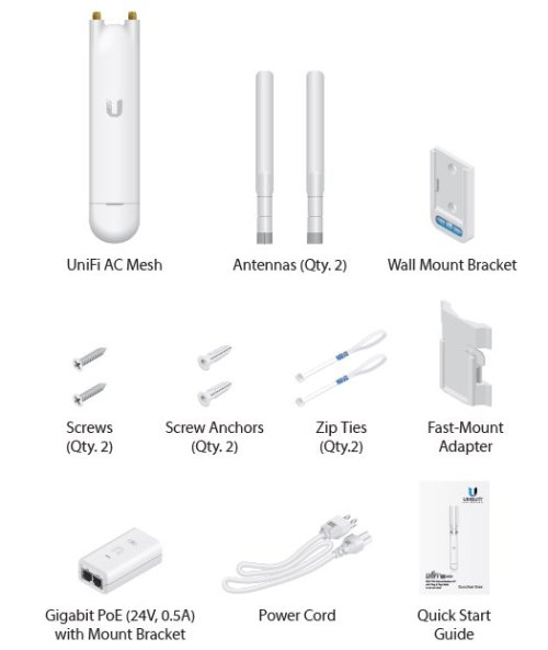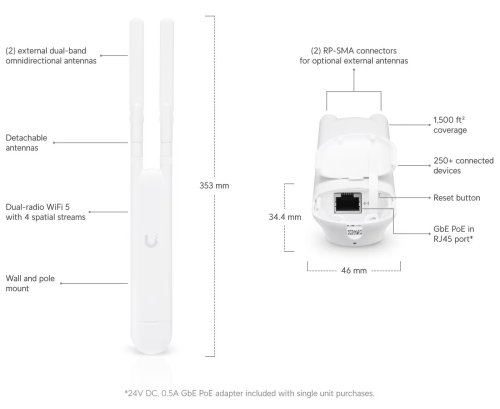 Okrem klasického napájania 24V passive Gbit POE určite oceníte aj možnosť napájania cez 802.3af POE. Jednotku môžete používať s pribalenými anténami so ziskom 3dBi (2,4GHz)/4dBi (5Ghz) alebo pripojiť k sektorovým anténam Ubiquiti.