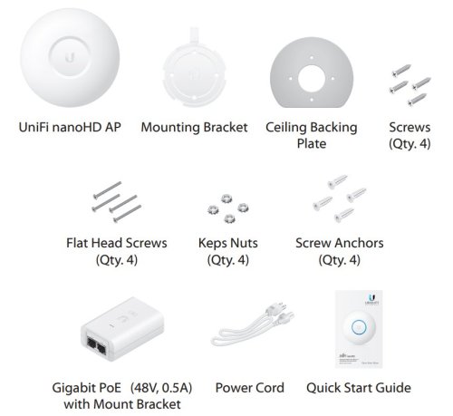 Vďaka nenápadnému dizajnu a jednoduchej montáži je vhodné do akéhokoľvek prostredia. Balenie obsahuje všetok potrebný materiál na montáž jednotky na stenu alebo strop. UniFi nanoHD je kompatibilný s držiakom pre UniFi AC Lite.