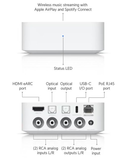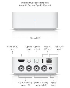 UniFi PoE Audio Port je všestranné zariadenie, ktoré umožňuje pripojiť tradičné zosilňovače, aktívne reproduktory alebo audio systémy k modernému bezdrôtovému streamovaciemu riešeniu. Vďaka podpore AirPlay, Spotify Connect a ďalších streamovacích služieb môžete ľahko prehrávať hudbu bezdrôtovo cez Wi-Fi a integrovať staršie audio vybavenie do chytrého audio ekosystému.