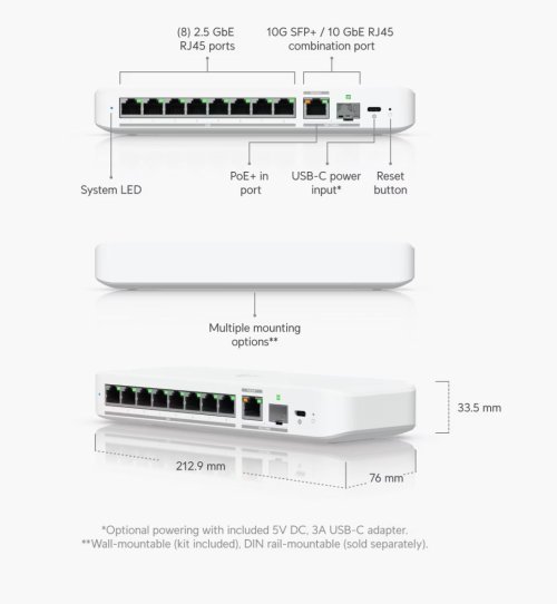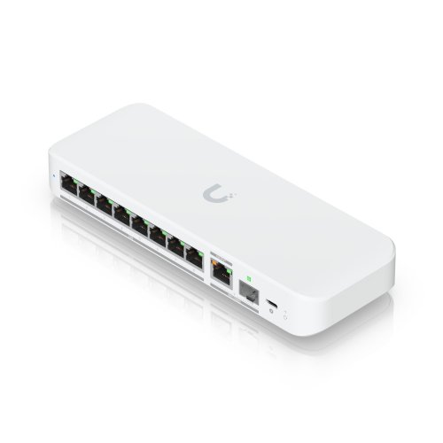 Flexibilný 8portový prepínač 2,5 GbE s kombinovaným uplinkovým portom 10 GbE RJ45/SFP+, ktorý je možné napájať pomocou adaptéra USB-C alebo PoE+.