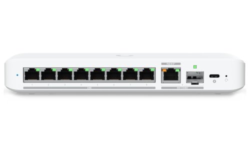 Porty: 8× 2,5 GbE RJ-45, 1× 10 G combo RJ-45 PoE+/SFP+, 1× USB-C (napájanie) Kapacita switcha: 60 Gbps (30 Gbps neblokovane) Rýchlosť smerovania: 44,64 Mpps Podpora2. Napájanie: externý USB-C adaptér (5 V) alebo PoE+ (42,5–57 V DC) Rozmery: 212,9 × 76 × 33,5 mm Hmotnosť: 420 g Max. spotreba energie: 14W Tlačidlo obnovenia továrenského nastavenia: áno