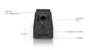 Hardware Maximálna spotreba energie: 8W Podporované napätie: 37-57V DC Napájanie: PoE Procesor: dvojjadrový čip Arm® Cortex®-A7 Hmotnosť: zariadenie 142g; s plochým držiakom 165g; s 20° klinom 179g Materiál krytu: polykarbonát, kov Materiál držiaka: tvarovaný plech Tlačidlá: tlačidlo zvončeka, factory-reset Prevádzková teplota: -30 až 50°C Prevádzková vlhkosť: 20–90 % nekondenzujúca NDAA compliant: áno Certifikácia: CE, FC
