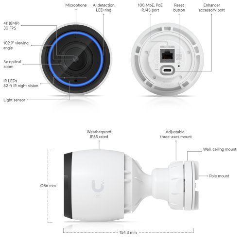 *Rozlíšenie videa 4K (8 MP) *3x optický zoom *Nočné videnie v infračervenom spektre na 25 m *Detekcia udalostí s umelou inteligenciou *Vstavané IR LED diódy a automatický IR cut filtrom *Záznam zvuku pomocou integrovaného mikrofónu *Pripojenie a napájanie pomocou PoE * Voliteľný Enhancer pre integrovaný reflektor a rozšírené IR žiarenie *Odolnosť voči poveternostným vplyvom (vystavené vonkajším podmienkam)