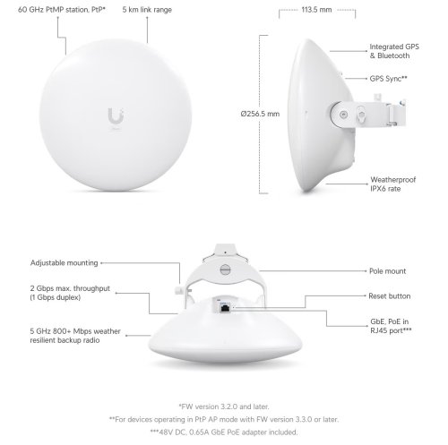 Procesor: dve jadrá ARM® Cortex®-A53 na 1GHz Pamäť: DDR3L 512MB Software: airOS® Režimy: stanice PtMP, PtP (*FW verzia 3.2.0 a novšia.) Sieť: režim Bridge/Router Sieťové rozhrania: 1x port GbE RJ45 Max. spotreba energie: 18W Napájanie: 48V DC, 0,65A gigabitový PoE adaptér (súčasťou balenia); môže byť napájaný UISP routerom alebo UISP switchom