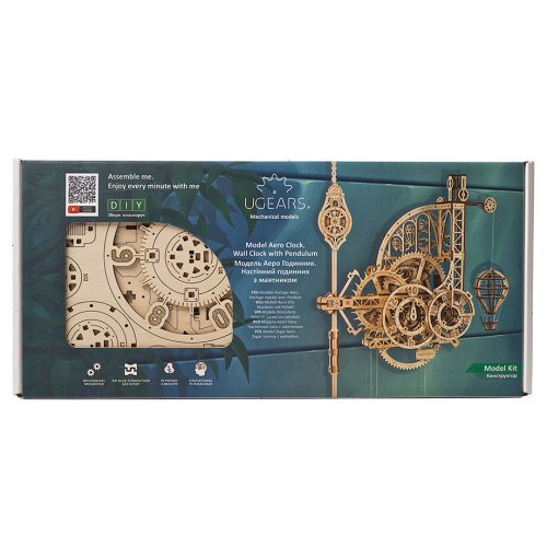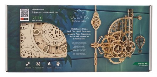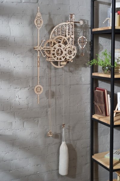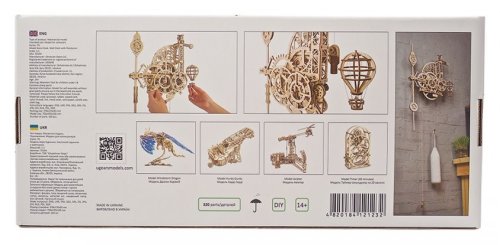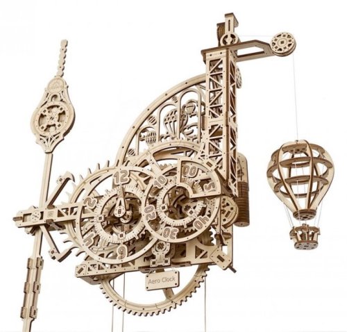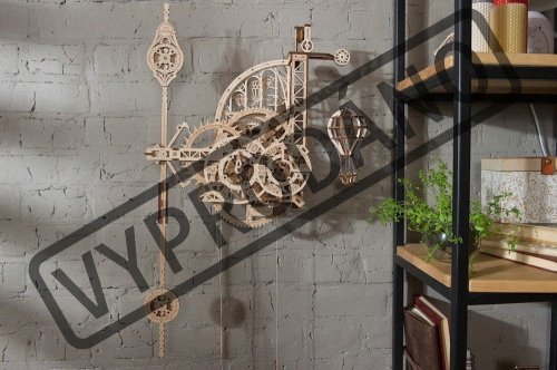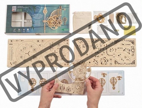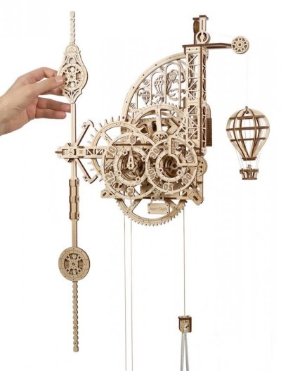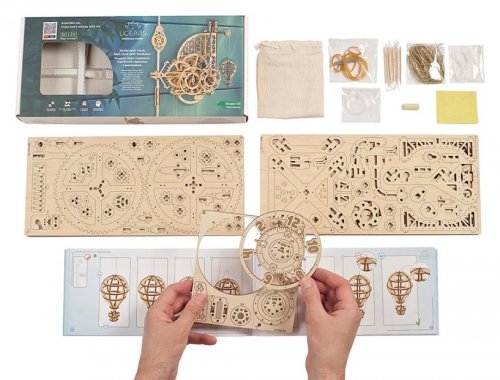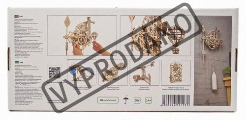 Nadišiel čas! Stavebnica nástenných hodín vyrobená z preglejky. Sledujte prácu gravitácie v súčinnosti s odhaleným hodinovým strojčekom. Uchváti Vás spracovaním kyvadla a krokového mechanizmu. Hodiny majú pevné ručičky, čas sa odčíta z dvojice ciferníkov otáčajúcich sa proti smeru hodinových ručičiek, čo prehlbuje výnimočný zážitok z ich sledovania. Zavesený model teplovzdušného balóna pravidelne v priebehu času pomaly stúpa a každú celú hodinu oznamuje poklesnutím. Dizajn modelu, inšpirovaný priemyselnou revolúciou a priekopníctvom letectva, osloví nielen technické, ale aj romantické povahy. Hodiny sú vybavené mechanizmom ladenia rovnovážnej polohy. Naťahovanie je zaistené hlavným závažím, pláteným sáčkom (súčasť balenia), do ktorého sa nasype piesok, či soľ. Jemné ladenie mechanizmu sa vykonáva pomocou závažia na kyvadlách a pomocou ďalšieho závažia je možné regulovať aj rýchlosť poklesu modelu teplovzdušného balóna. Nastavenie ciferníkov a presného času sa vykonáva s pomocou mechanickej západky. Vybavené detailným návodom na zostavenie. Hlavné vlastnosti: 320 precízne vyrezaných dielikovvysoká obtiažnosť zostavenieoznamovania celé hodinyširokej možnosti ladenia navrhnuté a vyrobené na Ukrajine