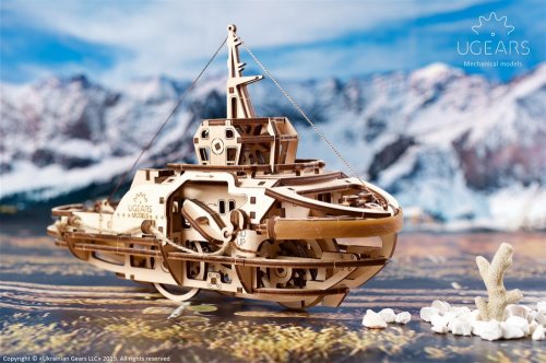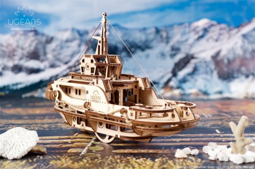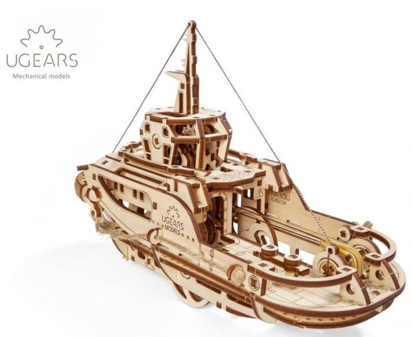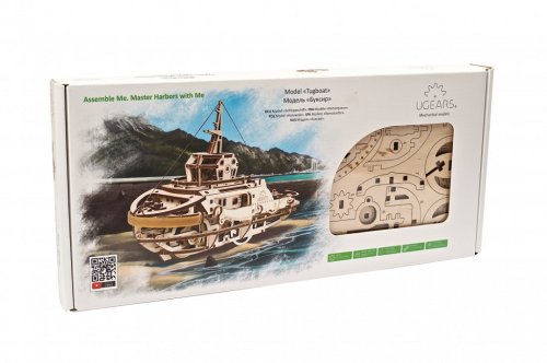 Stavebnica mechanického modelu remorkéra sa skladá zo 169 dielov vyrobených z vysoko kvalitného dreva a obsahuje všetko, čo budete potrebovať na zostavenie (vrátane nití, háčikov a lán). Kvalita dielov je prvotriedna: na rezanie predmetov z preglejkovej dosky sa používa laserová metóda, ktorá zaisťuje presné ryhy detailov. Jednotlivé diely je možné ľahko vytlačiť z dosiek a spojiť bez použitia lepidla či špeciálneho náradia pomocou priloženého návodu, ktorý je súčasťou balenia. Remorkér je poháňaný gumovým motorom, ktorý je poháňaný napätím gumy spojené s ložiskom. Redukčná prevodovka prenáša energiu na hnacie koleso a ďalej na asymetrickú dvojicu kolies. Kyvadlo spomaľuje a vyrovnáva pohyb remorkéra. Asymetria dvojice kolies prepožičiava modelu jedinečný spôsob pohybu, ktorý napodobňuje loď hojdajúcu sa na vlnách, zatiaľ čo pracovné kyvadlo vytvára špecifický hluk podobný hluku, ktorý vydáva skutočný dieselový motor, ktorým je mnoho lodí vybavených. Navíjací kľúč na hnacom kolese je blokovaný račňovým ozubeným kolesom. K dispozícii sú dve ovládacie páky, z ktorých jedna zastaví mechanizmus a druhá ho spustí - stopovacia a štartovacia páka. Pomocou dvoch lán s hákmi zaháknite a prepravte malý náklad – napr. modely na kolesách alebo papierovú loď. Váš zostavený remorkér bude jazdiť od 1,5 do 3 metrov v závislosti od typu povrchu. Prístav je bránou mora. Otvorte túto bránu, pripravte sa na cestu, staňte sa pánom prístavu so svojím novým sladkým a spoľahlivým remorkérom od firmy Ugears. Hlavné vlastnosti: 169 precízne vyrezaných dielikovkvalitný materiál a spracovanievhodné od 14+ vekuľahká obtiažnosť zostavenia približne 2,5 hodínrozvíja jemnú motoriku, trpezlivosť a priestorovú predstavivosťnávod na zostavenie je súčasťou balenianavrhnuté a vyrobené na Ukrajine