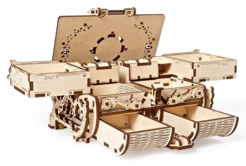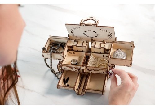 Svoju drahú polovičku do nej neuložíte, ale iné poklady áno! Stavebnica šperkovnica vyrobená z preglejky. Objavte kúzlo jednoduchého, ale efektného mechanizmu, vďaka ktorému sa skrinka rozloží a odhalí záplavu rozmanitých priehradok na Vaše drobné cennosti. Jej zostavenie nie je nijako zložité a zábavne Vám spestrí voľnú chvíľku. Je podrobne dekorovaná mnohými pútavými krivkami a ornamentmi, vynikne preto zvlášť na toaletnom stolíku, skrášli ale aj bežnú policu. Skvelý romantický darček pre všetkých, ktorí dokážu zdieľať aj Vaše nadšenie pre stavebnice a mechaniku! Vybavené detailným návodom na zostavenie. Hlavné vlastnosti:185 precízne vyrezaných dielikovstredná obtiažnosť zostavenia8 rôznych priehradieknavrhnuté a vyrobené na Ukrajine