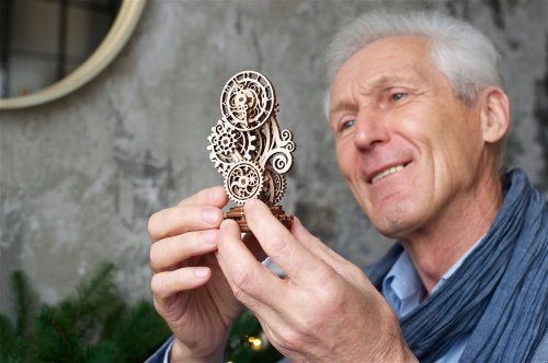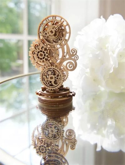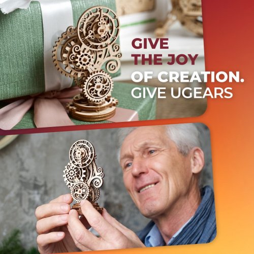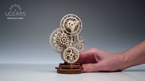 Retrofuturisticky!: Stavebnica okrasnej imitácie hodín vyrobená z preglejky. motívy. premýšľa, ako vstúpiť do sveta mechaniky UGEARS, alebo hľadajú drobný darček pre zvedavcov, ktorí s jeho pomocou môžu mladšie naučiť rozpoznávať hodiny. Vybavené detailným návodom na zostavenie
