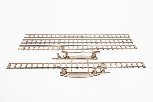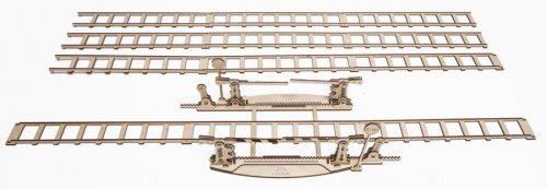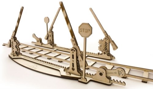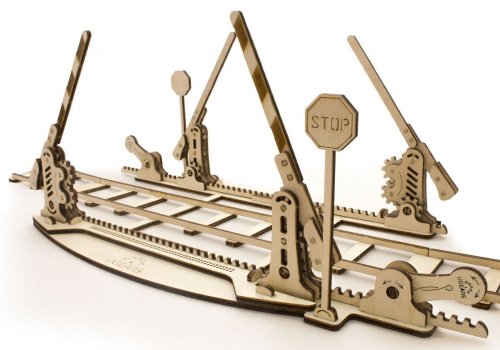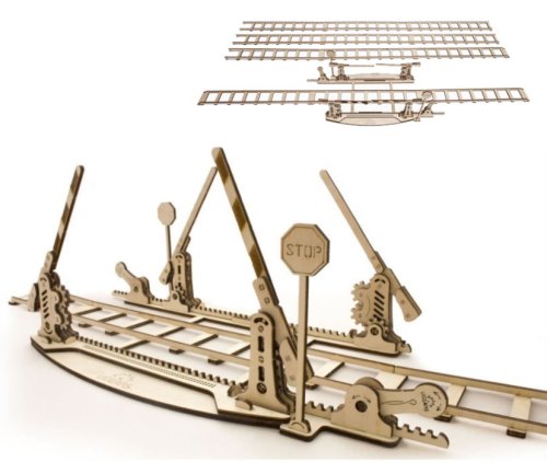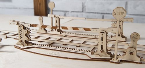 Súprava drevených koľají s pohyblivými závorami je skvelým doplnkom Ugears lokomotívy či vlakovej stanice. (Lokomotíva a stanica nie sú súčasťou balenia).