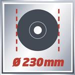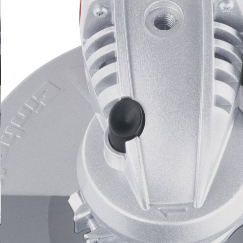 Kotúč s maximálnym priemerom 230 mm chráni posuvný bezpečnostný ochranný kovový kryt a ľahko ho vymeníte pomocou zámku vretena (kľúč je schovaný v rukoväti). Plochá kovová hlava prevodovky zamedzuje rušivým vibráciám pri práci a sprístupňuje ťažko dosiahnuteľné miesta.