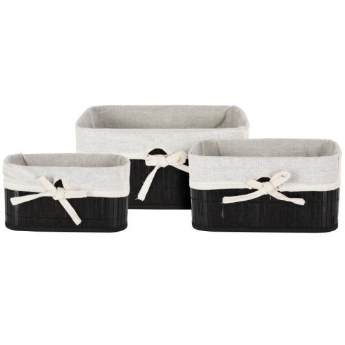 • materiál: bambus / bavlna - pevná konštrukcia z bambusových lamiel - prírodný materiál, ktorý je ľahký, ale pritom odolný, nepraská a má dlhú životnosť - košíky možno využiť ako multifunkčný úložný priestor na skladovanie kozmetiky, hračiek, oblečenia, doplnkov, šperkov, potravín, atď. - jemný prírodný vzhľad, ktorý sa hodí do každej miestnosti - sada obsahuje 3 košíky v troch veľkostiach: - malý: 24 x 14 x 12 cm - stredný: 29 x 19 x 14 cm - veľký: 34 x 24 x 16 cm - farba košíka: čierna
