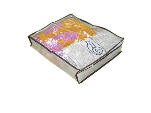Praktický úložný vak pod posteľ chráni oblečenie alebo periny proti poškodeniu a zašpineniu. Vak úložný je vyrobený z netkanej textílie + PVC je dobre umývateľný od nečistôt. Vkladanie vecí do obalu je možné z prednej strany, ktorá je zapínateľná pomocou zipsu. Čelná strana je potom opatrená priehľadným oknom pre zistenie obsahu obalu. Úložný vak je veľmi šikovným a skladným pomocníkom na úschovu textílie alebo perín napr. pod posteľ. Rozmery - 35 x 30 x 8 cm.