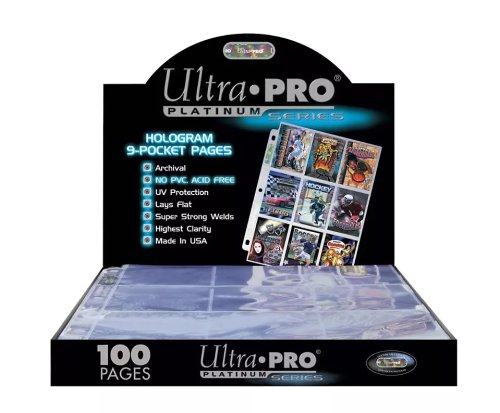 Ultra PRO Platinum Hologram stránkové obaly na 9 kariet. Kvalitné stránkové obaly na archiváciu vašej zbierky zberateľských kariet a iných zberateľských predmetov. Stránky obsahujú vrecká na 9 kariet štandardizovaných rozmeroch 6,35 x 8,89 cm (2-1/2" x 3-1/2"). Stránky sú na oboch stranách priehľadné a sú predlisované 11-dierovým chrbtom pre flexibilné prispôsobenie.