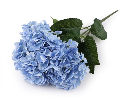 Umelá kytica hortenzií zaujme svojim realistickým vzhľadom a precíznym spracovaním. Vynikne vo vázach alebo zakomponovaná v kvetinových väzbách a aranžmánoch. Tvorí ju 5 stoniek s bohatým kvetenstvom. Vnútri každej stonky je drôt. Jednotlivé kvety vám môžu poslúžiť ako dekorácia venčekov do vlasov. Priemer jedného kvetenstva je cca 12 cm.